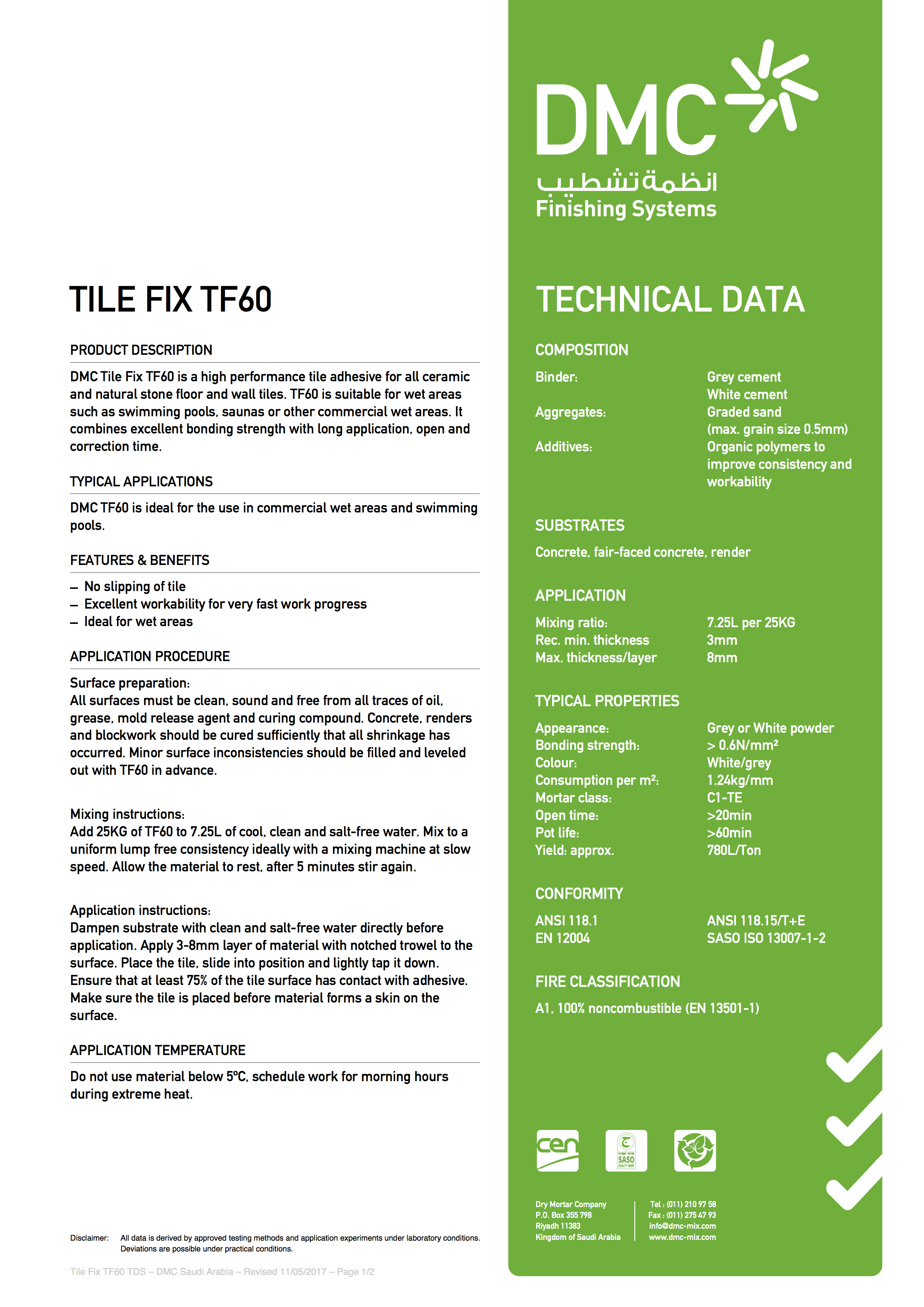 DMC Tile Fix TF60 is a high performance tile adhesive for all ceramic and natural stone floor and wall tiles. TF60 is suitable for wet areas such as swimming pools, saunas or other commercial wet areas